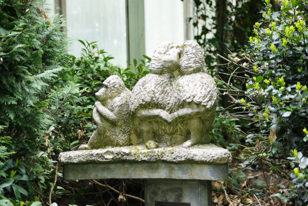 Mantelbaviaan met jong, beeld van Franse kalksteen, Dierenpark Rhenen